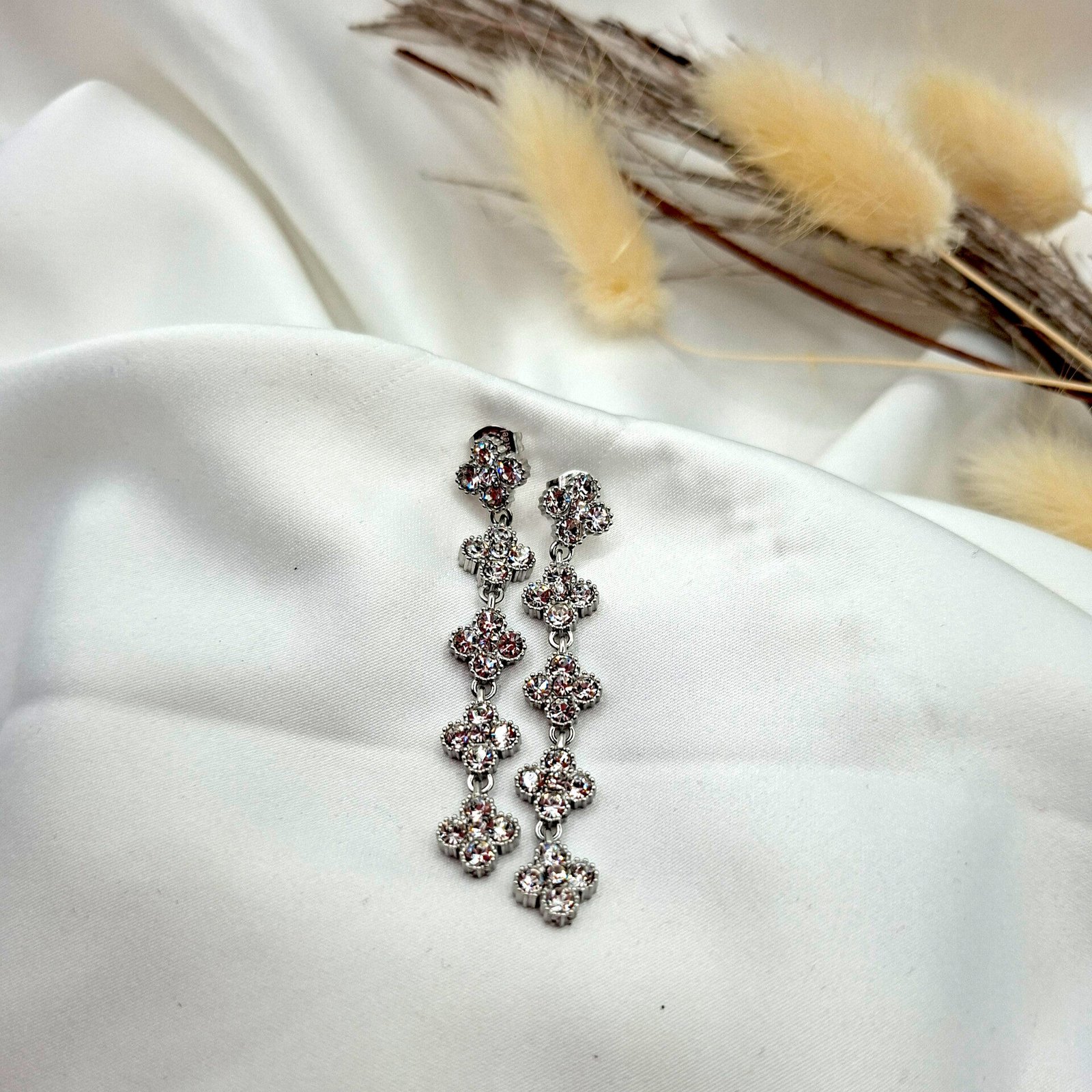 Εντυπωσιακά κρεμαστά σκουλαρίκια σε σχήμα λουλουδιού με στρας, για λάμψη που ξεχωρίζει. Ιδανικά για κάθε περίσταση.