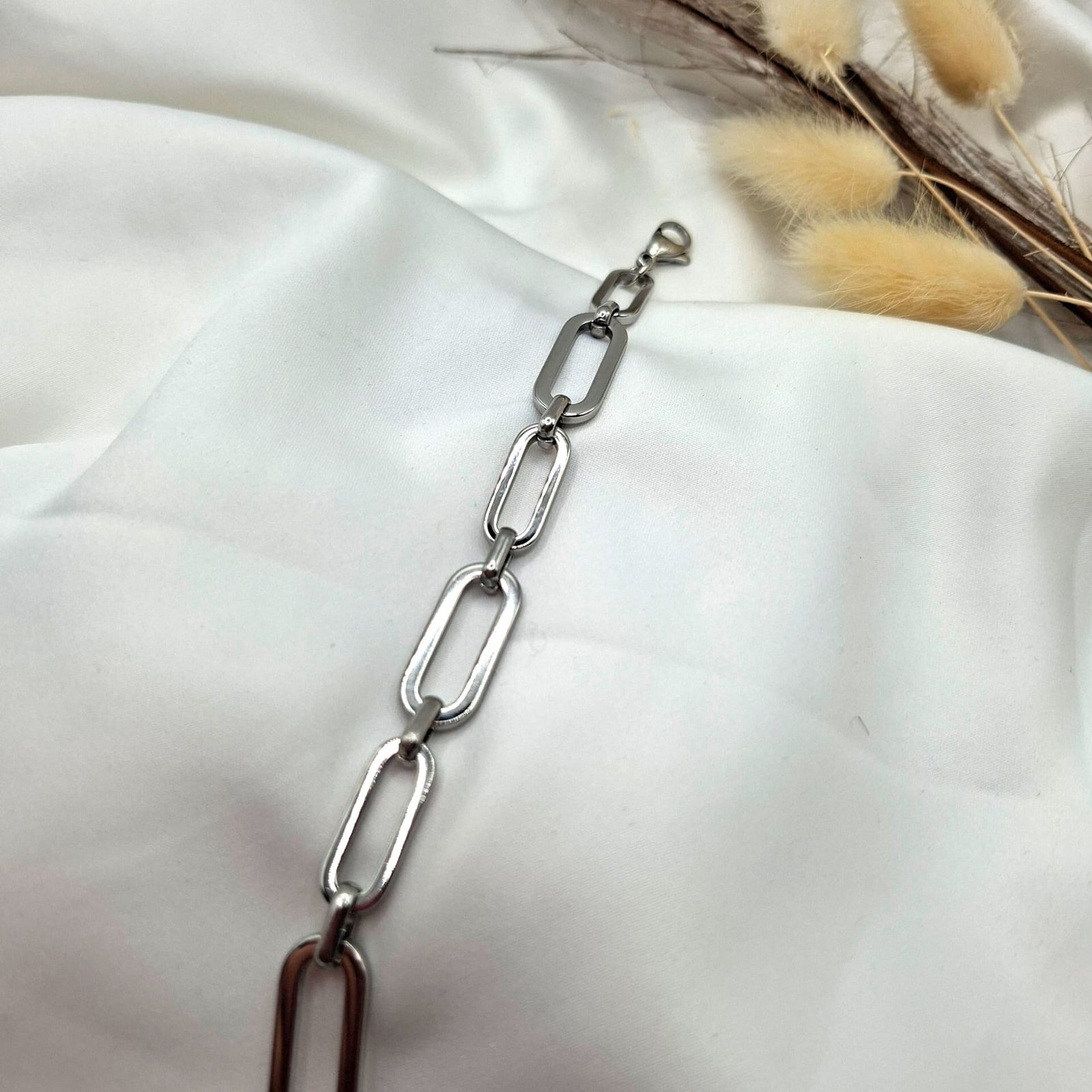 Βραχιόλι τύπου ‘paperclip’ από ανοξείδωτο ατσάλι. Το βραχιόλι χαρακτηρίζεται από επίπεδους επιμήκεις κρίκους . Αυτό το σχέδιο είναι μοντέρνο και προσφέρει μια κομψή και μινιμαλιστική αισθητική. Διατίθεται και σε ασημί απόχρωση.