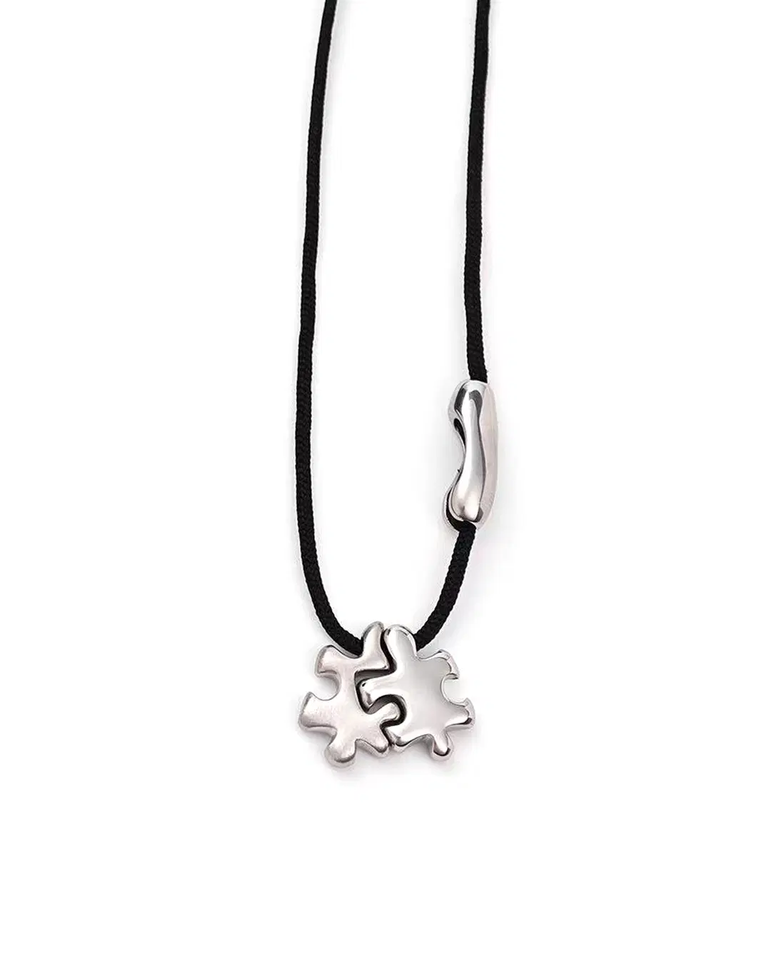 Κολιέ με μενταγιόν σε σχήμα παζλ από ανοξείδωτο ατσάλι με μαύρο κορδόνι. Ένα casual κόσμημα για καθημερινές εμφανίσεις.